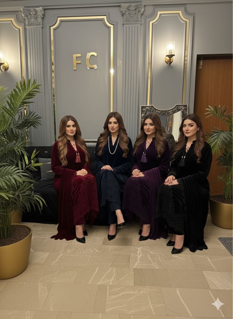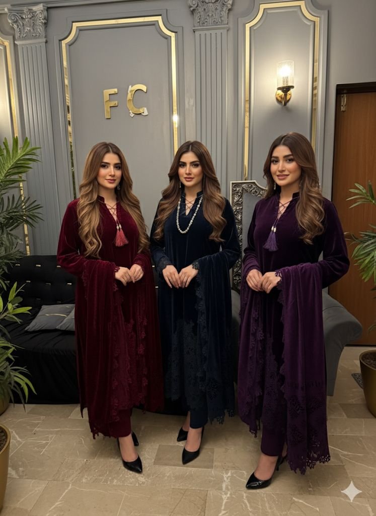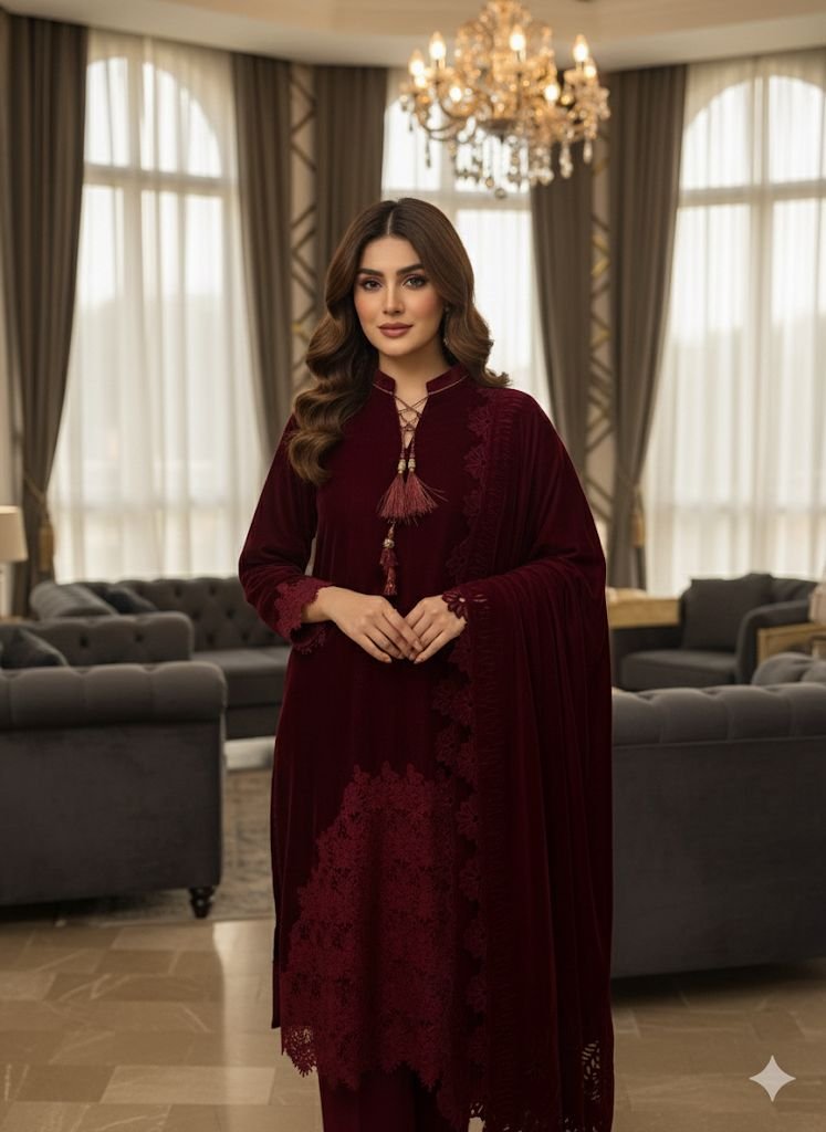9000 Micro Velvet Pure Suit – Elegant Qureshia Work on Daman, Full Velvet Laser Cut Shawl & Silk Trousers